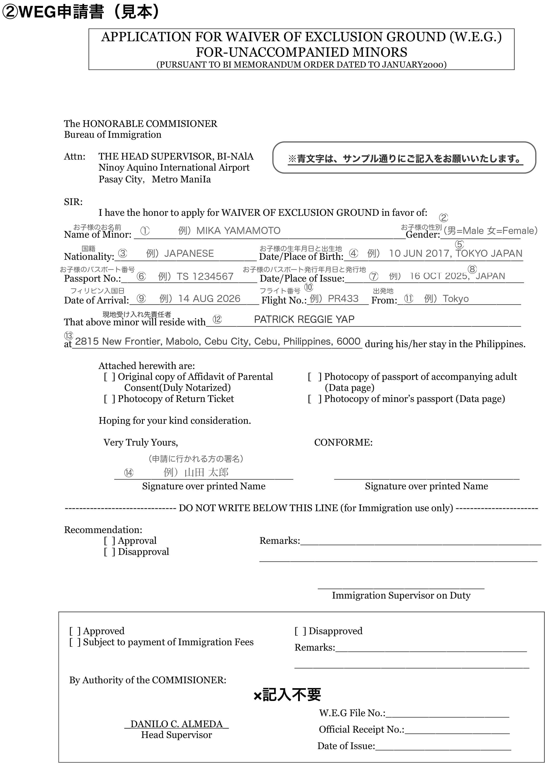 フィリピンでは、フィリピン国籍以外の15歳未満のお子様が戸籍上で両親となる保護者どちらかの同伴なしで入国することを、フィリピン入国法にて禁止されています。WEG(Waiver of Exclusion Ground)を渡航前にフィリピン大使館にて認証手続きもしくは、公証人役場にて公証をもらうことで、入国除外規定の免除申請となり、保護者の同伴なしの単独もしくは、代理のガーディアンを立てて渡航が許可されます。 WEGの認証手続きは渡航前に終える必要があり、原則的には、ご自身で申請を行って頂きます。また、入国時にもWEG対象者は入国審査前に認証済みのWEG申請書の提出、WEG申請料のお支払いの手続が必要になります。