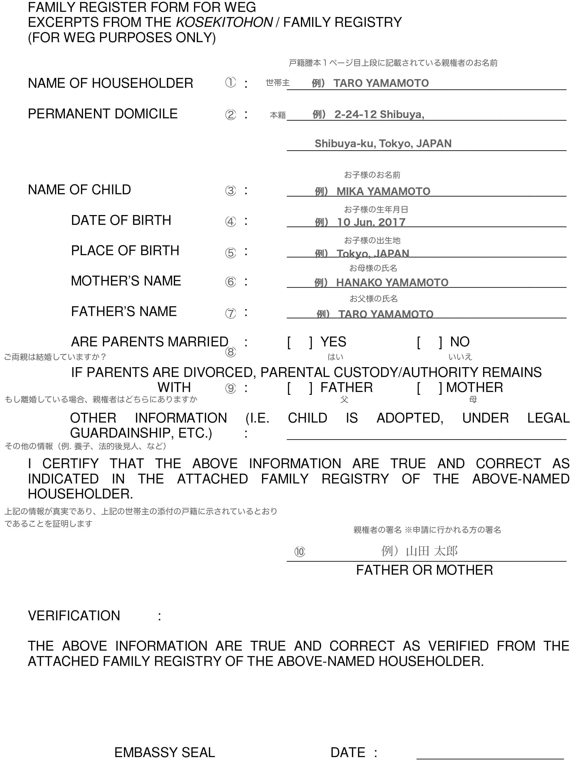 フィリピンでは、フィリピン国籍以外の15歳未満のお子様が戸籍上で両親となる保護者どちらかの同伴なしで入国することを、フィリピン入国法にて禁止されています。WEG(Waiver of Exclusion Ground)を渡航前にフィリピン大使館にて認証手続きもしくは、公証人役場にて公証をもらうことで、入国除外規定の免除申請となり、保護者の同伴なしの単独もしくは、代理のガーディアンを立てて渡航が許可されます。 WEGの認証手続きは渡航前に終える必要があり、原則的には、ご自身で申請を行って頂きます。また、入国時にもWEG対象者は入国審査前に認証済みのWEG申請書の提出、WEG申請料のお支払いの手続が必要になります。